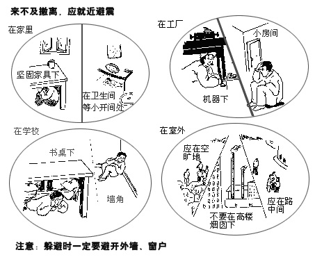 大的晃动时间约为1分钟左右。这是首先应顾及的是您自己与家人的人身安全。首先,在重心较低、且结实牢固的桌子下面躲避,并紧紧抓牢桌子腿。在没有桌子等可供藏身的场合,无论如何,也要用坐垫等物保护好头部。