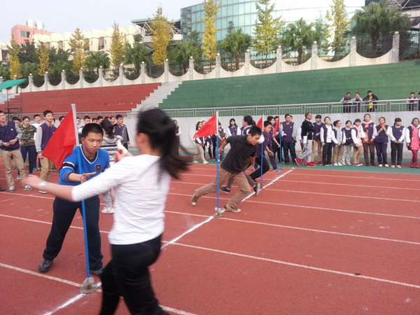 “加油!加油!”操场上响起了此起彼伏的呐喊声。25日下午,初2014级全体同学进行了一场别开生面的接力赛。