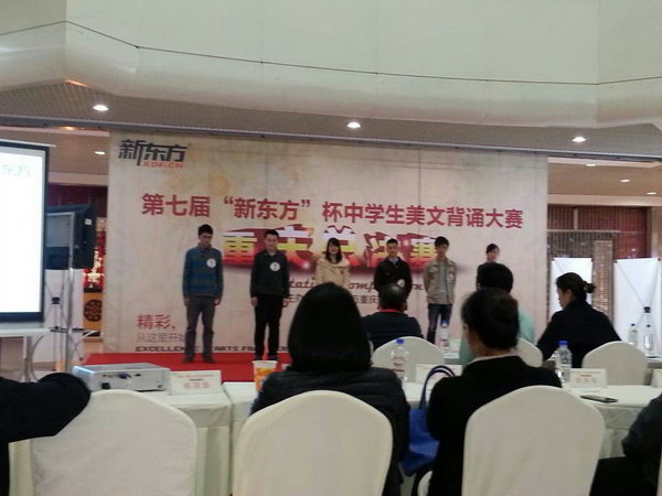 2014年3月15日,由新东方重庆学校主办的第七届“新东方杯”中学生美文背诵大赛重庆总决赛场完美收官。比赛当日,通过层层PK,最终我校高2016级9班姜云峰同学获得了全市高中组亚军。