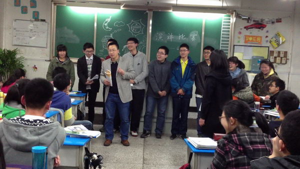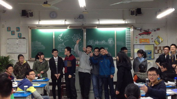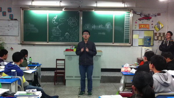 比赛还未开始,关东组的成员还在紧张的筹备着他们所负责的这一场班级盛会:策划,主持,寻找外援,安心准备自己的演讲,每个人都有着自己的任务,明确的分工创造了高效;设计,书写,美化黑板,细心整理选手的资料,其他小组也在为这一场盛会献力。不分你我的团结互助让空气都充满了温暖的味道。
