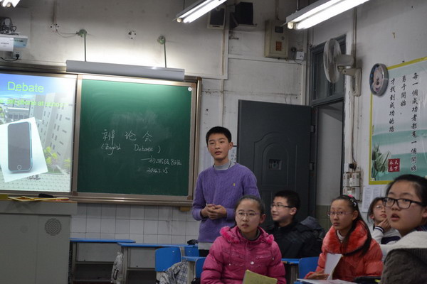 2014年3月,初2015级8班举行了以“学生是否应带手机到学校”为主题的英语辩论赛。辩论双方以冯田和罗嘉骏为代表展开了激烈的竞争。首先,双方一辩用具有高度概括性的陈述为本场辩论开篇立论。然后双方互相反驳。而到了比赛的自由辩论阶段,可以迎来了本场辩论赛的转折点。由于双方主辩使用高难度的英语词汇,导致主持人池志毫也出场辩论,所以场面演变为池志豪与两方辩论。池志豪与双方针锋相对,非常激烈,火药味十足。最终池志豪以灵活的思维和缜密的逻辑推理,赢得此场辩论赛的胜利,其他同学也在此次活动中收获了不少知识,留下了深刻的印象。