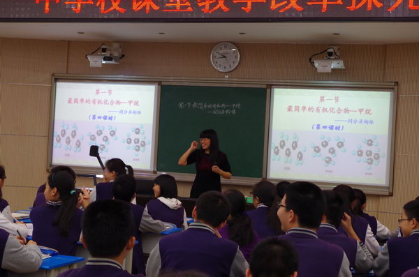 2014年4月28日星期一早上第一、二节课,高2016级化学备课组周金玲、邹玉兰两位老师在我校多媒体教室(2)分别奉献了一节精彩的同课异构公开课。内容是高一化学必修2第三章第一节《最简单的有机化合物甲烷》。吸引了众多老师前来听课。