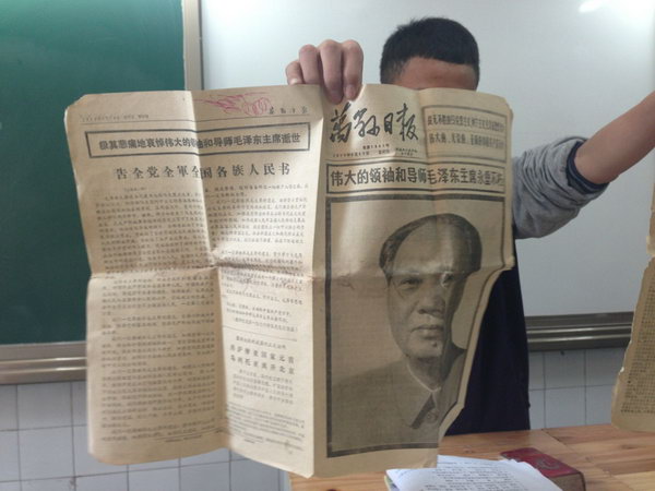 毛主席逝世之后的报纸,80年代末的小人书,人民公社时的粮票,7、80年代的小额钞票,文革时期的宣传队照……而“历史之星”自然当属周霖浩同学的关于毛主席逝世之后的报纸。这件宝物跨越38年历史,再现了毛主席的伟大和人民心中对其的崇高敬意。