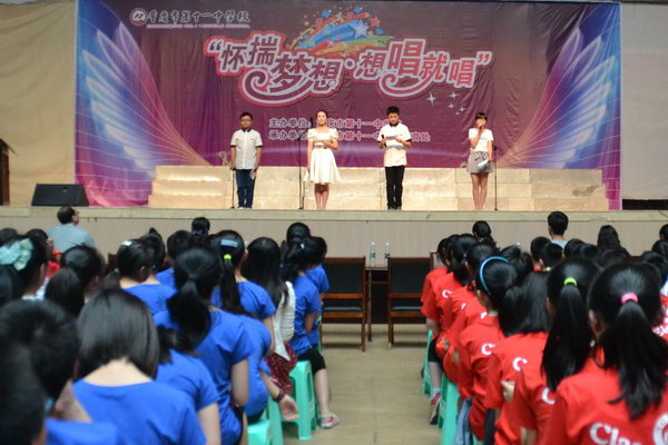 体育馆里,初2016级各班正在举行“怀揣梦想,想唱就唱”合唱比赛。