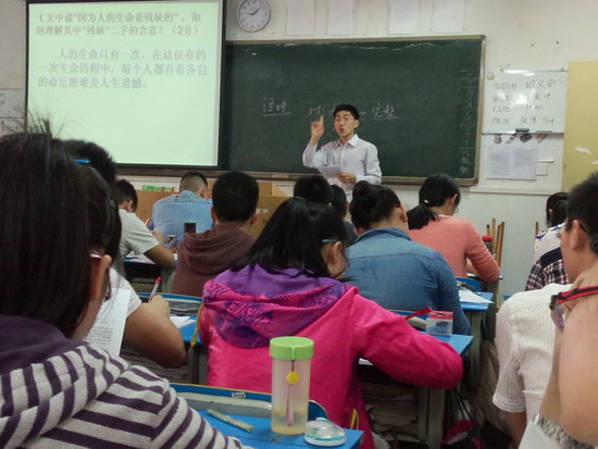 2014年5月13日上午,高2014级语文组封庆老师与田卫老师的同课异构展示课分别在高三12班、高三11班教室举行。本次同课异构以《紫藤》这篇阅读为依托,分别展示了两位老师在阅读评讲课思路的不同处理方式,得到了备课组老师的好评。