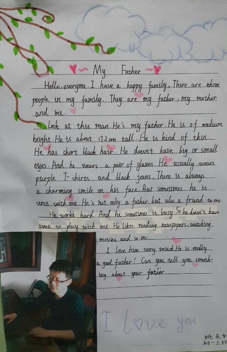 告别了春日的绚丽,我们迎来了热烈的五月。五月,如一首激昂雄壮的歌,唤起人们心中的热血,奋发向上;五月,似一泓甘甜的清泉,滋润人们久枯的心田,重生自信;五月,若一幅长卷,记录同学们光彩的一页页;五月,也蕴藏着那一份父母温情。初一(3)班迎来了“父母时代”。看,那天蓝色的墙上贴着的一张张五彩的作文,真心的照片,绚丽的背影,以及优美的作文,也成了初一(3)班一道美丽的风景线。每一篇优美英语作文,每一张精心挑选的照片都流露出了同学们对自己父母的爱。纸包不住火,更包不住爱,但那一张张小小的作文纸,那一篇篇小小的照片,那一个个小小的字迹……都是数也数不尽的爱。没错,这就是初一三班的“I like my mother and father”秀,于2014-5月隆重上映!