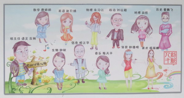 朋友,你是否也曾想过把老师画成卡通形象做成一面老师形象墙?是的,初2016级14班的同学们就做了这样的创新。
