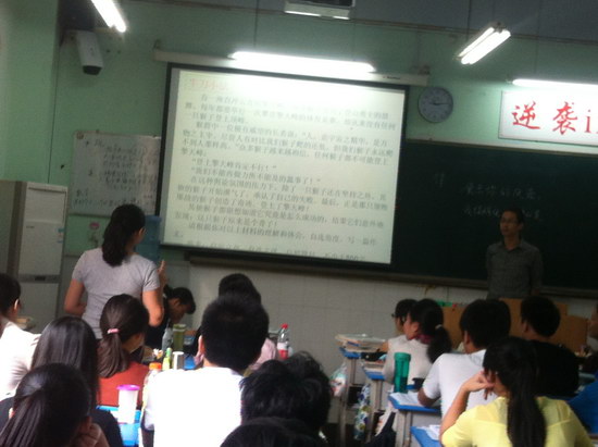给材料作文,是既考查学生的分析思维能力,又考查学生的语言运用能力的重要题型,因此,近几年的高考,基本上都是重头戏。要想学生的考场作文写得比较出彩,前提就是立意深刻,为此,董强、方永平两位老师以此作为本堂课的教学目标。在具体的教学过程中,董强老师侧重分析学生审题立意时容易出现的三类错误,归纳出精要的分析方法,提醒学生规范分析,尽量做到观点全面、针对性强、适合自己写作。整堂课思路清晰,分析精当,具有典型的示范作用。方永平老师侧重指导学生掌握全面概括材料的主要内容,立足全局、抓住前因后果提炼主要寓意的方法。整堂课收放自如,学生积极主动参与,师生互动妙趣横生;尤其是老师的下水作文似的文段指导,获得了学生的热烈掌声。两堂课虽然切入点不同、风格各异,但一样的精彩,充分展示了我十一中语文教师的魅力。
