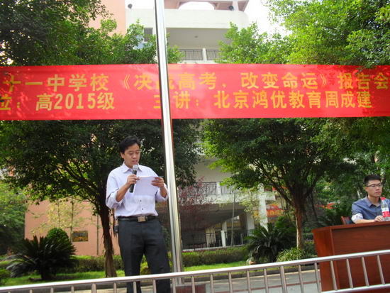 2014年10月26日下午3:00,来自北京鸿优教育的周成建老师为CBD全体学子献上了一场题为“决战高考,改变命运”的报告会。学生们早早地返校,在操场摆好各班的凳子,期待着周老师能带来一场别开生面的讲座。下午三点,阳光灿烂,CBD全体学子带着笔记本齐聚操场,讲座准时开始。