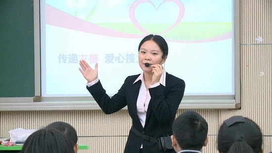 谭老师先给大家播放了一段小视频《一个人温暖一座城》,全国优秀志愿者、全国三八红旗手、感动重庆十大人物周纪萍30多年来义务照顾孤寡老人的感人事迹让在场全体师生无不震撼;接着学生朗诵感动重庆组委会授予的颁奖词更让大家对周幺婶的友善与执着佩服得五体投地;更让学生们欢欣鼓舞的是今天谭老师把周幺婶请到了我们的课堂与同学们面对面地交流,当周幺婶给大家分享自己的事迹时,一个个感动得潸然泪下;当同学们得知周幺婶从照顾孤寡老人到现在热心各项社区公益服务,从一个人到现在组建了200多人的洗衣队,6000多名志愿者参加的爱心队伍,同学们深深地领悟到友善在传递,文明在发展;最后同学们决心接下友善的接力棒,加入志愿者行动,成为“小幺婶”中的一员,同学们填写了志愿表,周幺婶亲自给同学们颁发了聘书,佩戴了红袖章,大家一起高声宣誓。