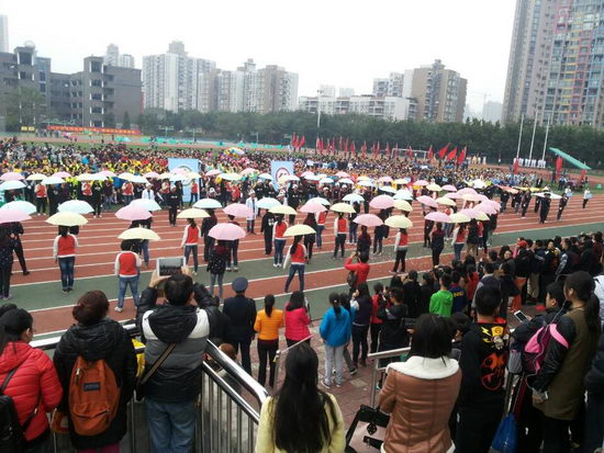 队伍的正中央,112名女生争先恐后给16名男生撑起五彩缤纷的小花伞,彰显了文科实验班孩儿们“今天我为你遮风雨,明天你为我挡太阳”的团队合作精神。