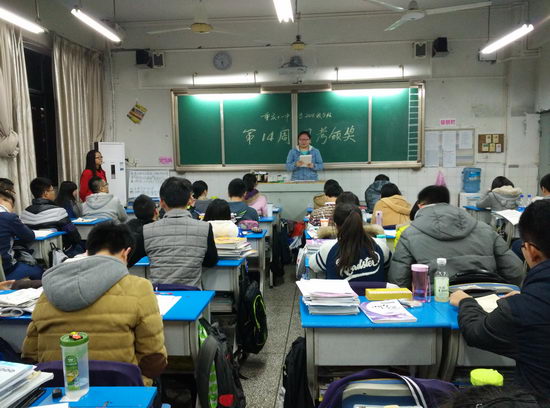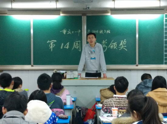 2014年12月10日,高2016级8班在教室举行第14周月考颁奖及后期动员大会,在班主任助理李林洁的主持下,83人次获奖学生一一登台领奖,教室里充满了朝气、欢声、思考。