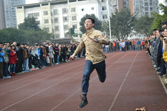 2015年1月11日下午3:00,我校高三年级全体师生在CBD校区操场参加了迎新春迎面接力比赛。为了比赛的安全,体育老师首先组织了一场全年级的热身运动,即将参赛的老师们也加入了热身运动,引来学生们一阵阵的欢笑声。