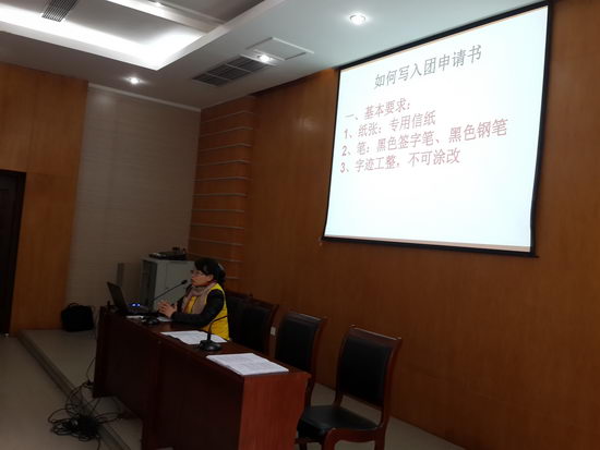 会上,蒋祥俊老师提出:我们作为学生,要在学习上争当优秀,要积极向党组织靠拢。作为一名共青团员,要在思想上进步,要学会自我反省,自我批评,成为合格的共产党员后备军。赖德东老师在接下来的讲话中指出,我们在学习中要能吃苦,要树立“我是优生”的精英思想。在张艳群老师的指导下,我们从“基本要求”“格式要求”“内容要求”三大部分学习了如何写好入团申请书。