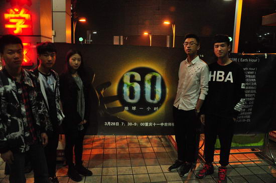 重庆市第十一中学校志愿者社团——聆心社自从2009年3月28日加入到“WWF‘地球一小时’活动”以来,一直坚持了七年,其间社团的成员换了一批又一批,聆心社克服了场地的协调、资金的短缺、时间的冲突、人员的变化等各种困难,一直坚持下去,因为,我们相信:再小的一件事,只要我们坚持,一直努力地坚持,我们的努力一定会取得收获!我们同在一片蓝天下,全球气候的变化,肯定会对我们的生活产生影响,而我们要做的就是以我们的微薄之力对周围环境的恶化做一点自己的贡献,能够带动身边的人做一点节约能源的事,那就更好了。