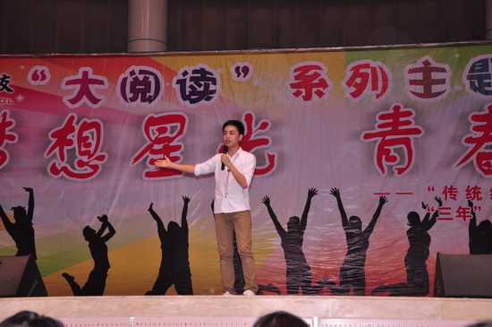 此次活动系 “大阅读”之“梦想星光,青春绽放”语文活动周的重要活动之一,是在我校“大阅读”理念支撑下,秉承建设“书香校园”的宗旨而开展的一次综合性活动。活动由以傅文霄、雷小利、金春三位老师牵头的大阅读课题组规划,高一语文组构思、策划、执行的。前后历时几个月,去岁寒假开始筹划,本学期开始启动,精心筹备,终于华丽上演。高一年级全部语文老师和全部学生都参与到其中来。高一年级活动过程简约而精致,经历班级海选、年级半决赛、决赛,最终决出六名顶尖高手备战与高二去年演讲比赛的六名种子选手同台角逐。