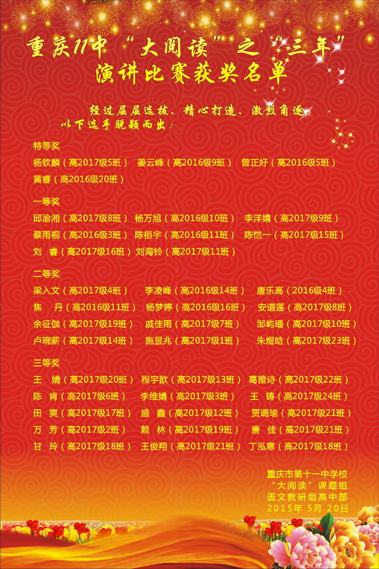 轰轰烈烈的“三年”主题演讲活动在思维的碰撞中,在选手和观众清楚与梦想的激情中、在浓浓的书香中落下帷幕。师生受益匪浅,一场阅读风暴有望通过此次活动吹遍全校。