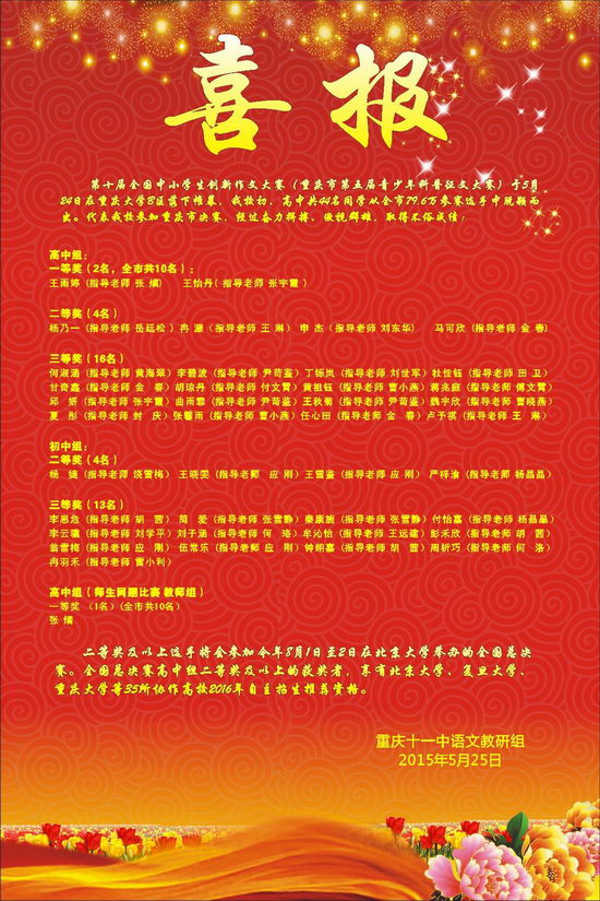 第十届全国中小学生创新作文大赛(重庆市第五届青少年科普征文大赛)于5月24日在重庆大学B区落下帷幕,我校初、高中共44名同学从全市79.6万参赛选手中脱颖而出。代表我校参加重庆市决赛,经过奋力拼搏、傲视群雄,取得不俗成绩: