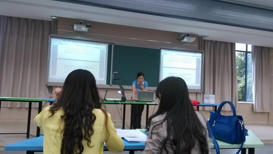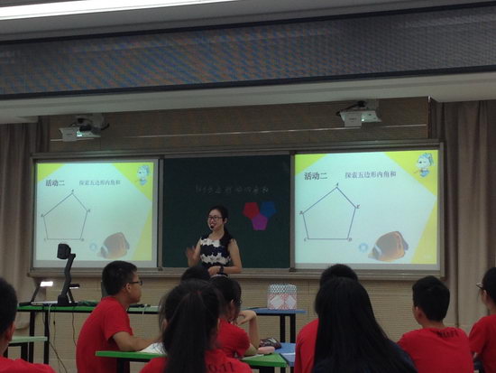 本次培训分三个阶段:第一阶段,由授课教师蒋冬梅老师说课,邓红葵老师介绍“课堂观察”基本理念,初二数学备课组成员针对课堂观察点向蒋老师提出疑问,设计观察量表;第二阶段,蒋冬梅老师执教《多边形的内角和》,初二数学备课组其它成员观课;第三阶段,观课成员上台就课堂观察点进行“用数据说话”的评课。
