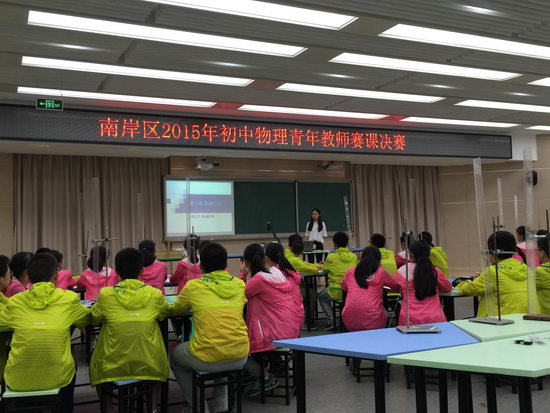 5月28日,南岸区2015初中物理赛课决赛在11中多媒体教室(一)举行,此次决赛得到了学校的大力支持。经过南岸区初中物理六个片区的角逐,最终我校初三年级陈怡代表弹子石片区进入决赛。本次赛课课题为八年级(沪科版)第十章第5节机械效率,决赛邀请了初中物理六个片区的组长担任评委,本次总分第一名选手将代表南岸区参加2015年重庆市初中物理优质课大赛。
