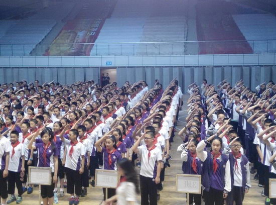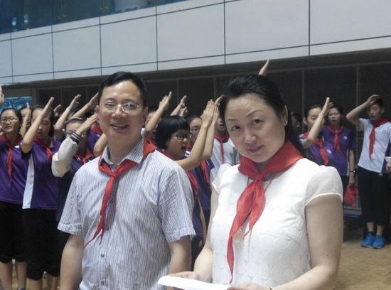 而给每个辅导员戴红领巾轰动全场。戴上红领巾的老师们似乎回到了童年,活力无限,仿佛多年前那条见证他们悲欢的红领巾仍静静躺在脖子上。他们笑容纯真,让我们从他们身上看到了青春。