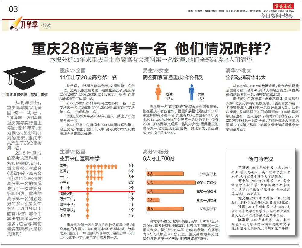 从明年开始,重庆高考将采用全国统一试卷。2004年—2014年重庆高考实行自主命题,这11年来,因为裸分、加分和并列的因素,重庆市共产生了28位高考第一名。