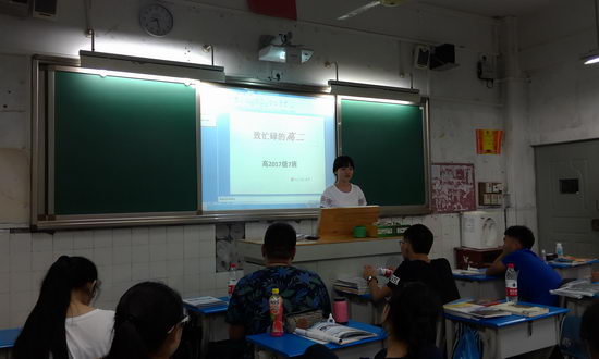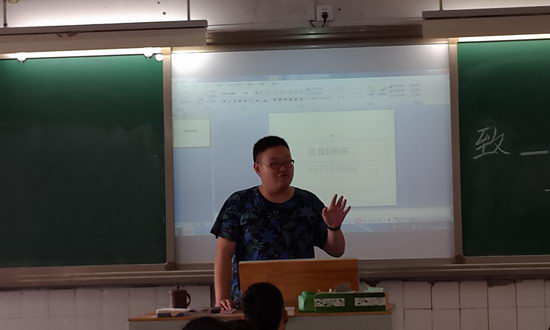 胖胖的班长走上讲台,“致我们的高二”