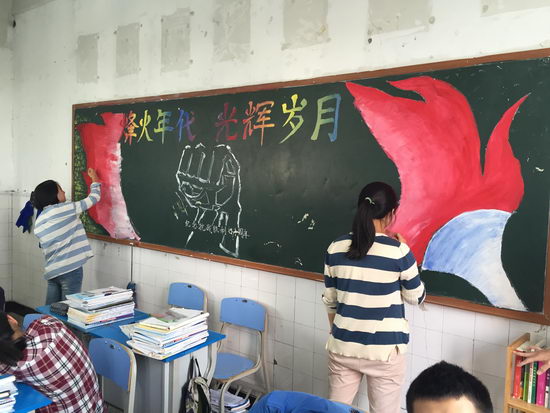 中国人民抗日战争暨世界反法西斯战争胜利70周年,我们看到了中国作为一个东方大国再一次的崛起!回顾历史,展望未来,内心的激动无法按捺,同学们开始了如火如荼的黑板报制作。大家都积极搜集素材,有绘画和书法才能的同学主动站出来,利用课余时间,在黑板上尽情抒发自己的爱国热情。