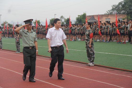 首先,在激昂的进行曲中,党委委员、副校长欧宾在基地教官的陪同下检阅了新生军训队伍。“同学们好”,“同学们辛苦了”,欧宾副校长代表学校向高2018级学子致以了真切地关怀和问候;“为校争光”,同学们以高昂的口号,饱满的热情向学校领导表露了发奋图强的决心。