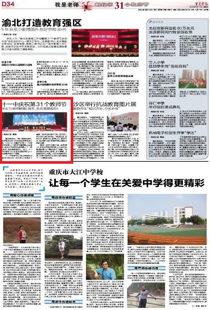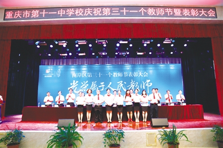 重庆商报讯 “啊,亲爱的老师,我怎能忘记你,你时时刻刻常在我心里。”9月9日,在重庆市第十一中学校庆祝第31个教师节暨表彰大会现场,学生们为学校的老师献上了一首《老师,我总是想起你》。会上,十一中对学校100多名先进老师和24个先进集体进行了表彰。