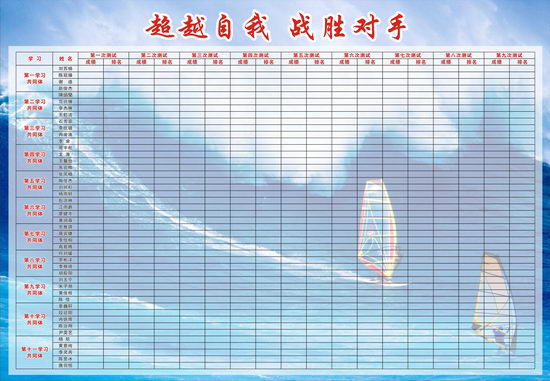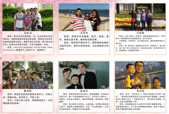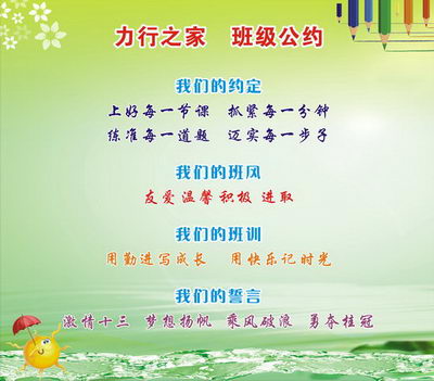 教室后面的那一方墙壁,板块众多,内容丰富。墙壁的正中央是每月一主题的黑板报;其右是“力行之家大本营”——上面有我们的班级全家福,班名班歌班训班级誓言及其诠释;其左是我们的是一个学习共同体;其下是“亲情加油站”—2.4*1.5(米)规格的泡沫板上,是同学们的家庭照和父母深情的寄语及我们的成长宣言,当我们略微倦怠之时,回眸凝望,父母殷殷的期待和自己铮铮的誓言,都无疑是我们行万里的“加油站”。