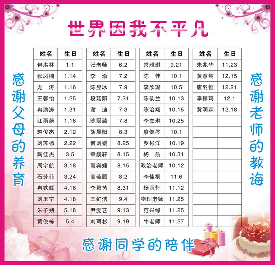 教室前后门的墙壁张贴着两个板块:“班级公约”板块写着全班学生共同的约定; “世界因我不平凡”这个板块,上面写满了同学与老师的生日。每当同学和老师的生日,在夕会课时间,教室里会回荡着深情的生日祝福话语和欢乐的《生日歌》歌声,过生日的同学将和全班同学一起交流自己的生日感言和成长感悟。