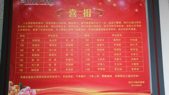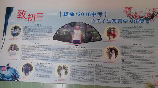 初三开学以来,大家的学习热情十分高涨,同学们就连课间也在座位上忙碌地复习着。但这也需要找到正确的方法和技巧才行。在修德楼四楼和五楼初三的走廊墙上,张贴了两张鲜红的喜报和一张“学霸秘籍”报。我们班的蒋权、黄旖旎在开学考试中进步显著,很荣幸上了其中一张进步显著奖的喜报,他们在学习中,懂得坚持不懈,持之以恒,那么进步便成必然。另一张喜报上表彰的是暑假作业完成优秀的同学,我班的张欣、谢裕如便在其中,她们定在暑假为初三做足了准备。