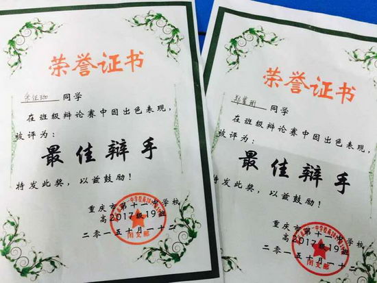 最后,郑鉴珩、余征珈同学摘得最佳辩手的称号。
