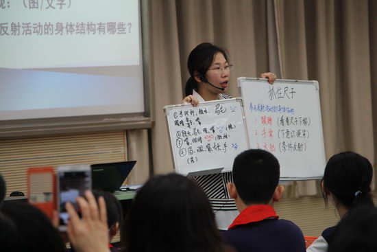 上午八点三十分,课堂教学观摩活动正式拉开帷幕。活动一开始,来自北京市海淀区教师进修学校附属学校的胡彬老师就为与会嘉宾和代表带来了一堂内容充实、形式新颖、深入浅出的初中生物课。胡老师以一段反映气象变化的视频导入本课内容——反射活动。为了让同学们对本课的知识有一个直观的概念,胡彬老师精心准备了膝跳反射、神秘的食物、诱人的气味和抓住尺子四个活动,让同学们在课堂上分组完成。在小组活动中,同学们积极讨论,勇于操作,通过用眼睛看、用嘴巴尝等方式亲身感受和理解了反射活动需要哪些身体结构参与才能完成这一重点知识。本堂课充分展示了体验式教学的积极作用,取得了极佳的课堂效果。课后,胡老师对其教学设计作了详细介绍。胡老师通过单元备课的方式对本课的知识进行了精准定位和准确把握,通过合理的活动设计,让学生在活动中理解和掌握本课的知识。胡彬老师新颖的教学理念,别具特色的教学风格获得了点评专家的一致赞扬。朱立祥执行主编从内容、目标、活动、评价四方面对本课进行点评。朱主编认为本课的内容基于学生;目标适合学生;活动吸引学生;评价促进学生,是一堂高质量的初中生物课。在肯定的同时,朱主编也提出两点建议,一是情景创设需要多思考;二是应该更加相信学生,不要急于让学生说出答案。郭华教授认为本课最具亮点的环节是小组活动,通过分组活动将课堂延展,且单元设计合理,取得了较好的课堂效果。郭教授从学习目标、活动体验、评价与学习目标的对应关系等角度提出了建设性意见。刘月霞副主任与胡老师就教学中存在的问题作了深入交流。刘主任首先肯定了胡老师作为一位年轻的老师勇于尝试、敢于创新的优秀品质,但也同时指出教师应在教学目标的设计上多加思考。三位专家的精彩点评赢得了与会代表的热烈掌声。
