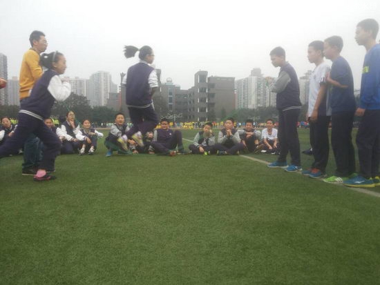 2015年11月4日星期三,快临近秋季运动会了,初一五班正在抓紧时间练习跳长绳,为运动会作准备。练习现场热火朝天,气氛热烈。绳子被同学们抡得呼呼生风,打得地面叭叭直响,同学们穿梭其间,精神抖擞,身轻如燕,动作敏捷,全身心地投入练习。挥动的长绳如银蛇飞舞,跳动的学生如彩蝶纷飞。