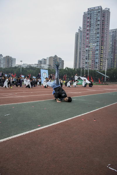 本次体育节有4个非毕业年级参加,各个年级都为本次的开幕式带来了精彩的课间操表演,其中,初中年级精心排演的武术体操最为出众。