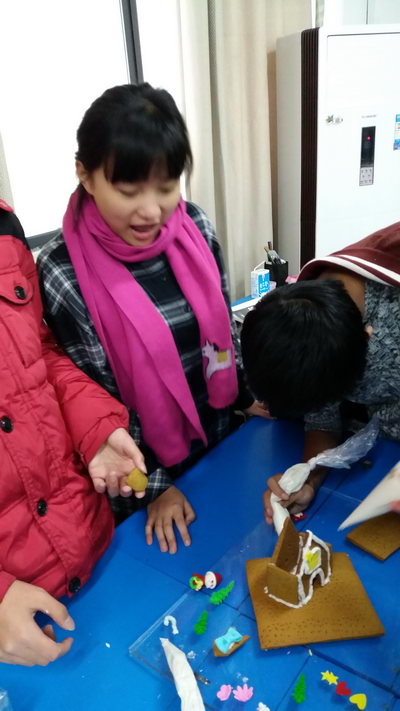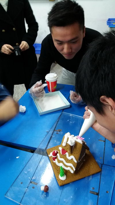 第二节课的下课铃声刚刚停止,我们就看见国际部的蓝老师带领几位身穿洁白的厨师服的工人,端着饼干、奶油等制作蛋糕的工具和器材来到了我们的教室。黄老师马上让我们分好组,拉好桌子,同学们自觉地迅速洗好手,期待着动手做蛋糕。上课铃还没拉,蓝老师就开始给我们介绍西方圣诞节的相关知识,特别强调了每个西方小朋友都会做的一道甜饼——姜饼屋,然后用视频的方式给我们详细地讲解了制作姜饼屋的每一道工序,强调了每一个细节。甜品师傅按组发放工具和原材料后,同学们手忙脚乱的行动起来,整体设计、房屋粘合、搭配颜色、雪花飘洒、视频点缀,各个工序,集思广益,相互学习,相互补充,精益求精。国际部蓝老师、易老师、甜品师傅也不停地指点,班主任黄伟老师俨然专业的摄像师,各个角度,每个同学都留下了美好的形象,还不停的现场直播,所有家长都真心的期待着我们的作品,为我们丰富而有趣的高中新生活点赞。我们的笑声也吸引了年级主任李建兵老师、年级组长徐顺光老师和其他班过往的同学前来观摩学习。这样的活动课,突出了国际班的特色,丰富了我们的课余生活,又培养我们的生活技能,还熔铸了师生间的浓浓情感。
