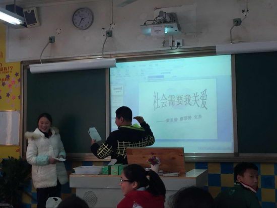 这次班会课的主题是“社会需要我关爱”。三个准备的同学可谓别出心裁。为了不让课堂枯燥无味,他们以两个节目来串起了这次政治课。