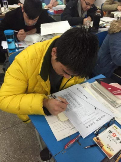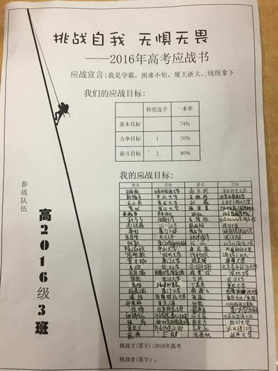 年级下达的应战书上印上了班级的宣言:“我是学霸,困难不怕。厦大浙大,统统拿下!”