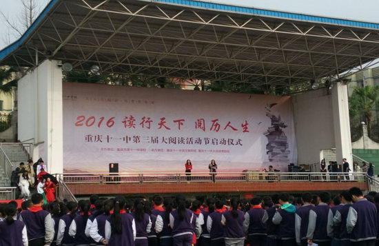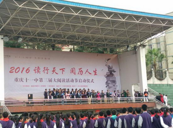 2016年3月21日10分,重庆市第十一中学2016年“读行天下,阅历人生”第三届大阅读活动启动仪式正式拉开了序幕。在启动仪式的开幕式上,十一中的老师和同学们伴随着阵阵古筝琵琶声,为台下观众带来了慷慨激昂的诗朗诵。在他们的感染下,同学们也跟着朗诵起来“落霞与孤鹜齐飞,秋水共长天一色。”