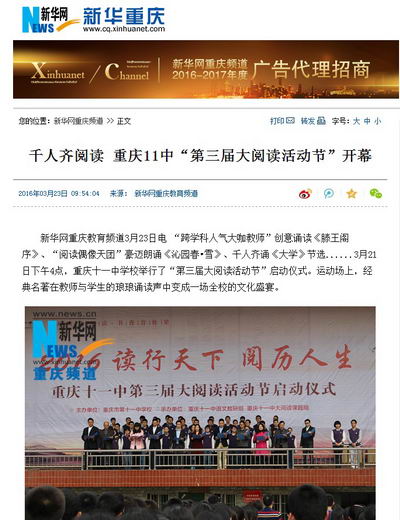 新华网重庆教育频道3月23日电 “跨学科人气大咖教师”创意诵读《滕王阁序》、“阅读偶像天团”豪迈朗诵《沁园春•雪》、千人齐诵《大学》节选……3月21日下午4点,重庆十一中学校举行了“第三届大阅读活动节”启动仪式。运动场上,经典名著在教师与学生的琅琅诵读声中变成一场全校的文化盛宴。