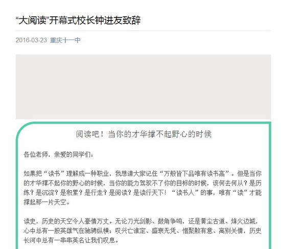 [重庆十一中 微信] “大阅读”开幕式校长钟进友致辞