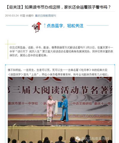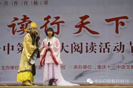 据悉,重庆十一中大阅读活动开展三年多,学校一直在积极思考怎样让阅读不浮与表面,而是真正的深入下去,转化为学会内在的品质与素养。本次大阅读活动各个环节也是基于这样的思考。从开幕式中的千人齐诵经典、校级领导组成的“阅读偶像天团”,到当天的名著经典角色展演,以及之后的故事“大讲台”,还有相关的个性书签风采展、摄影图片展、旧书交换、微视频展播等活动,在校园里营造了浓浓的阅读氛围。