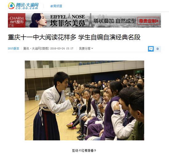 “杜丽娘”、“柳梦梅”、“安东尼奥”、“夏洛克”……3月23日,一群中外名著的经典角色来到重庆十一中大阅读活动节现场,为2500多名学生展示了经典名著。据了解,这些著名角色全部由十一中的学生扮演,他们改编剧本,创新思路,用昆曲、话剧、评书、花鼓戏等多种方式展现了《牡丹亭》、《威尼斯商人》、《水浒传》、《桃花扇》等中外名篇名段。