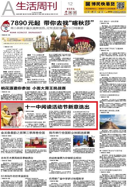 重庆商报讯 “读行天下,阅历人生”。上周,重庆十一中举行第三届大阅读活动节,学生们不光有集体阅读朗诵活动,还将书本搬上了舞台、讲台和书签,用不同的形式来表达自己对于阅读的热爱。