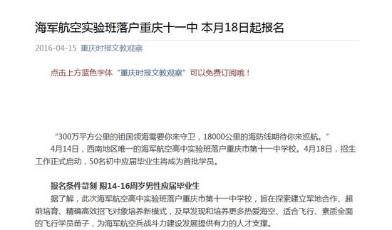 4月14日,西南地区唯一的海军航空高中实验班落户重庆市第十一中学校。4月18日,招生工作正式启动,50名初中应届毕业生将成为首批学员。