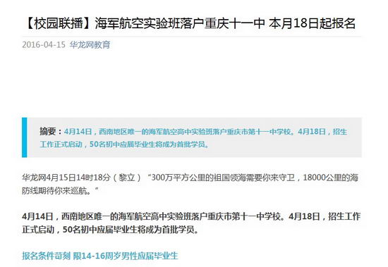 4月14日,西南地区唯一的海军航空高中实验班落户重庆市第十一中学校。4月18日,招生工作正式启动,50名初中应届毕业生将成为首批学员。