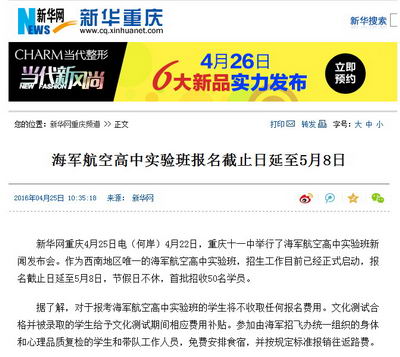 新华网重庆4月25日电(何岸)4月22日,重庆十一中举行了海军航空高中实验班新闻发布会。作为西南地区唯一的海军航空高中实验班,招生工作目前已经正式启动,报名截止日延至5月8日,节假日不休,首批招收50名学员。