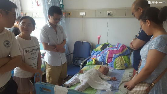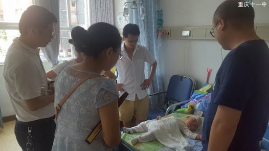 6月23日上午11时左右,外面骄阳似火,热浪滚滚,初2016级年级领导小组成员们无惧酷暑,乘车40分钟到重庆儿童医院看望了柏婷婷老师的孩子。病床上楚楚可人的小不点因患重病而做了头部手术。此时,孩子正在药物的作用下昏睡,赖组长一行人详细询问了孩子病情、手术情况以及孩子的照顾和护理等,柏老师前段时间为了备战中考,不顾孩子的病情,坚持到中考结束后,才有时间给孩子做手术,同时,她为了年级的工作,克服重重困难,未向年级组和学校请过一次假。这种奉献和敬业精神感动着在场的每位成员。最后,年级组希望她能好好照顾自己的孩子,有什么困难可以向年级组提出来,我们一起来帮助解决,因为我们是相亲相爱的一家人,亲情永存!